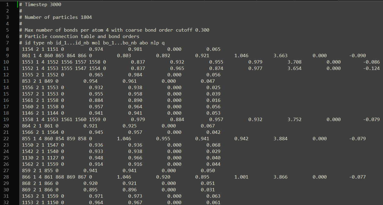 键序文件记录了原子间化学键的键序(bond order)信息,用于追踪化学键的形成与断裂过程。键序文件可通过以下命令导出,详见 fix reaxff/bonds。