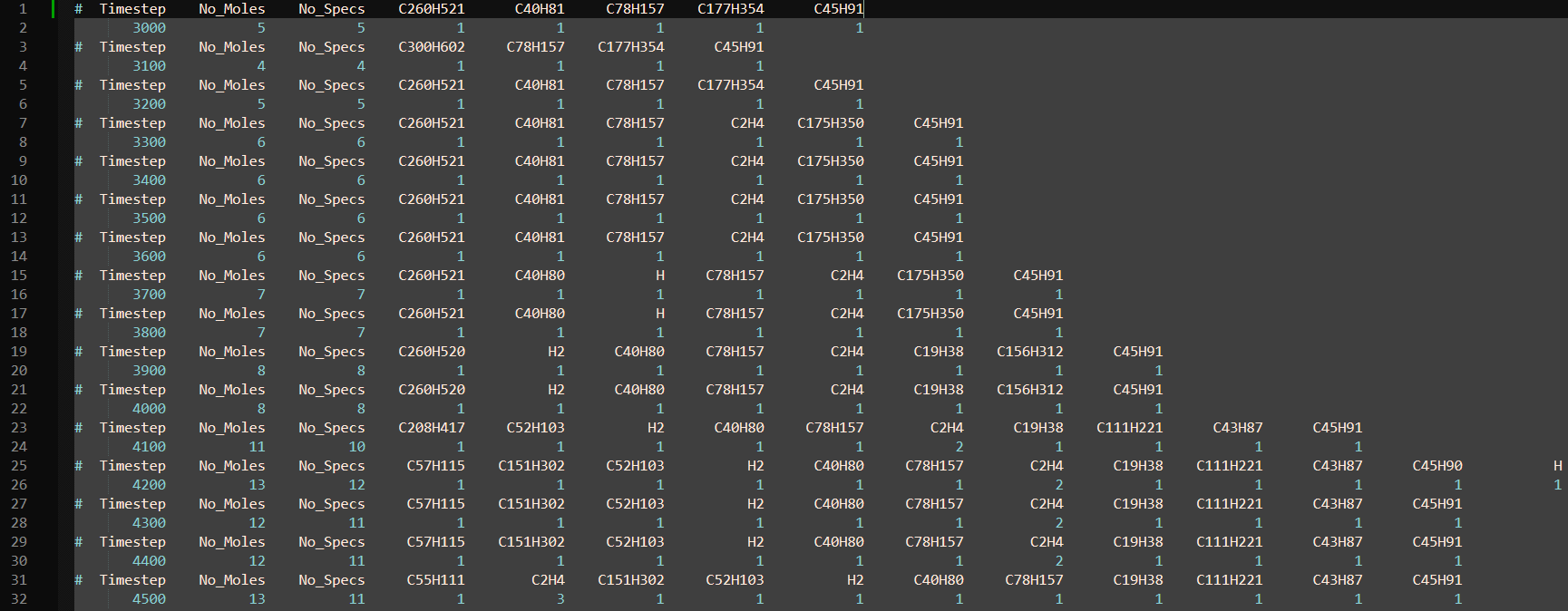 物种文件记录了模拟过程中各时间步的物种(分子)信息。在 LAMMPS 中可以通过以下命令导出分子文件,详见 fix reaxff/species。
