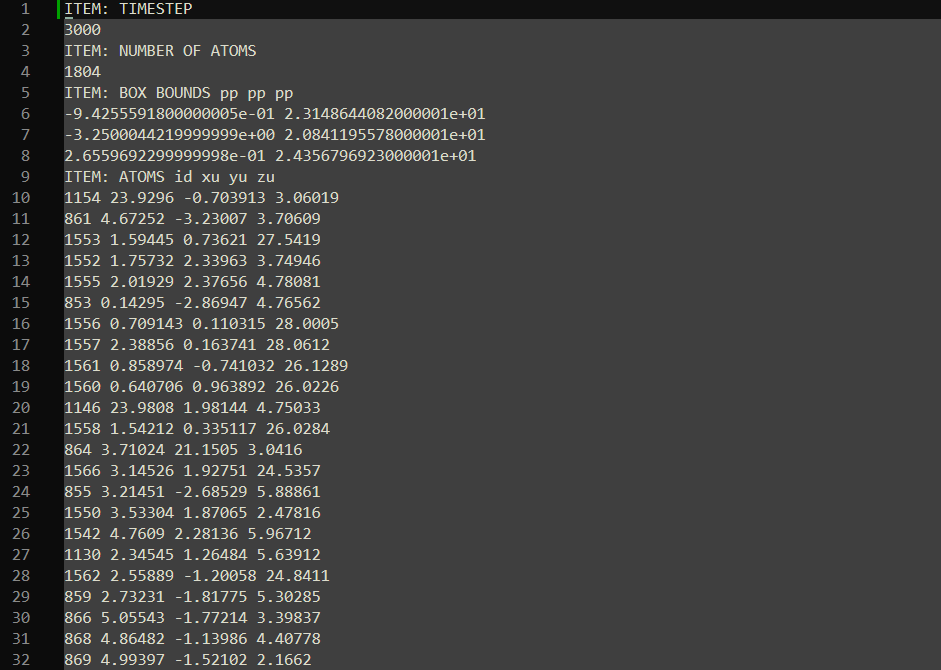 轨迹文件包含原子在每个时间步的坐标信息,用于3D可视化和区域追踪分析。轨迹文件可通过 dump 命令导出,详情见 dump。